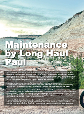 I travelled 13,000 miles over the last three weeks, sharing my story at two different motorcycle events. After checking out my high mileage Tenere 700 at the Yamaha display, I get asked many questions about reliability and my maintenance schedule. There are different types of maintenance schedules, there is preventative mainte- nance, there is following the factory recommended maintenance, there is maintenance that you do because you have to, and then there are repairs; some expected and some. not so expected.