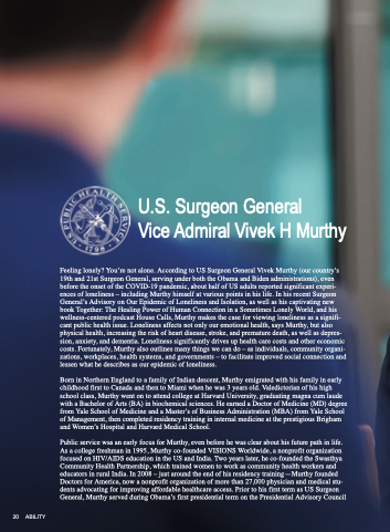 Feeling lonely? You’re not alone. According to US Surgeon General Vivek Murthy (our country’s 19th and 21st Surgeon General, serving under both the Obama and Biden administrations), even before the onset of the COVID-19 pandemic, about half of US adults reported significant experi- ences of loneliness – including Murthy himself at various points in his life. In his recent Surgeon General’s Advisory on Our Epidemic of Loneliness and Isolation, as well as his captivating new book Together: The Healing Power of Human Connection in a Sometimes Lonely World, and his wellness-centered podcast House Calls, Murthy makes the case for viewing loneliness as a signifi- cant public health issue. Loneliness affects not only our emotional health, says Murthy, but also physical health, increasing the risk of heart disease, stroke, and premature death, as well as depres- sion, anxiety, and dementia. Loneliness significantly drives up health care costs and other economic costs. Fortunately, Murthy also outlines many things we can do – as individuals, community organi- zations, workplaces, health systems, and governments – to facilitate improved social connection and lessen what he describes as our epidemic of loneliness.