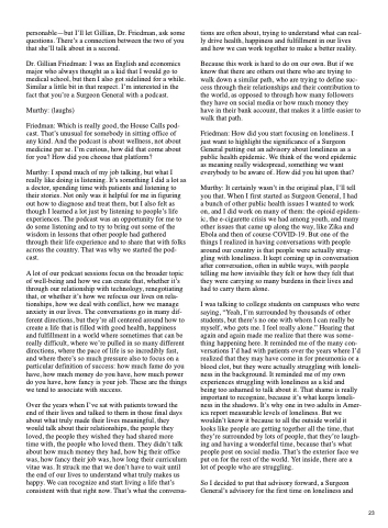 Murthy: It certainly wasn’t in the original plan, I’ll tell you that. When I first started as Surgeon General, I had a bunch of other public health issues I wanted to work on, and I did work on many of them: the opioid epidem- ic, the e-cigarette crisis we had among youth, and many other issues that came up along the way, like Zika and Ebola and then of course COVID-19. But one of the things I realized in having conversations with people around our country is that people were actually strug- gling with loneliness. It kept coming up in conversation after conversation, often in subtle ways, with people telling me how invisible they felt or how they felt that they were carrying so many burdens in their lives and had to carry them alone.