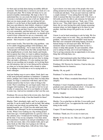 for them and can help them during incredibly difficult moments. The bottom line is, however you look at it, we all need each other. We’re better off when we’re con- nected in healthy relationships. My hope is that if we understand that, we can create the kind of society where everyone is included and no one is left out. Right now, there are too many people who are feeling left out, whether it’s on the basis of their health and abilities, their race and ethnicity, their beliefs, whatever it might be. People for one reason or another are feeling that they don’t belong and don’t have a chance to be a part of a real community, and that hurts all of us. That’s one of the key messages from our advisory: we should all be vested in how connected we are as a community, and when we talk about community, inclusion is a key com- ponent – that everyone is a part of that community.