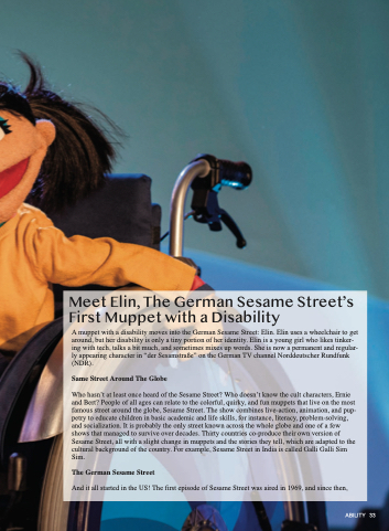 A muppet with a disability moves into the German Sesame Street: Elin. Elin uses a wheelchair to get around, but her disability is only a tiny portion of her identity. Elin is a young girl who likes tinker- ing with tech, talks a bit much, and sometimes mixes up words. She is now a permanent and regular- ly appearing character in “der Sesamstraße” on the German TV channel Norddeutscher Rundfunk (NDR).