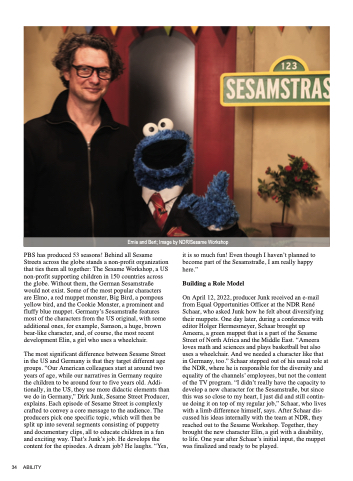 On April 12, 2022, producer Junk received an e-mail from Equal Opportunities Officer at the NDR René Schaar, who asked Junk how he felt about diversifying their muppets. One day later, during a conference with editor Holger Hermesmeyer, Schaar brought up Ameera, a green muppet that is a part of the Sesame Street of North Africa and the Middle East. “Ameera loves math and sciences and plays basketball but also uses a wheelchair. And we needed a character like that in Germany, too.” Schaar stepped out of his usual role at the NDR, where he is responsible for the diversity and equality of the channels’ employees, but not the content of the TV program. “I didn’t really have the capacity to develop a new character for the Sesamstraße, but since this was so close to my heart, I just did and still contin- ue doing it on top of my regular job,” Schaar, who lives with a limb difference himself, says. After Schaar dis- cussed his ideas internally with the team at NDR, they reached out to the Sesame Workshop. Together, they brought the new character Elin, a girl with a disability, to life. One year after Schaar’s initial input, the muppet was finalized and ready to be played.