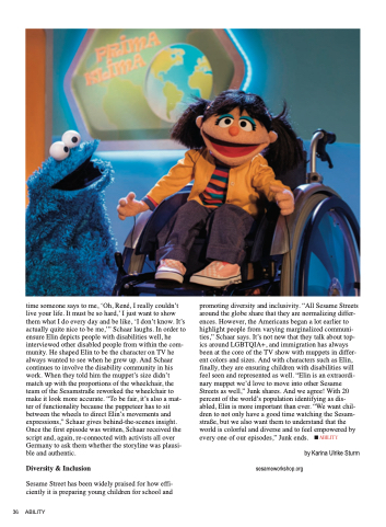 time someone says to me, ‘Oh, René, I really couldn’t live your life. It must be so hard,’ I just want to show them what I do every day and be like, ‘I don’t know. It’s actually quite nice to be me,’” Schaar laughs. In order to ensure Elin depicts people with disabilities well, he interviewed other disabled people from within the com- munity. He shaped Elin to be the character on TV he always wanted to see when he grew up. And Schaar continues to involve the disability community in his work. When they told him the muppet’s size didn’t match up with the proportions of the wheelchair, the team of the Sesamstraße reworked the wheelchair to make it look more accurate. “To be fair, it’s also a mat- ter of functionality because the puppeteer has to sit between the wheels to direct Elin’s movements and expressions,” Schaar gives behind-the-scenes insight. Once the first episode was written, Schaar received the script and, again, re-connected with activists all over Germany to ask them whether the storyline was plausi- ble and authentic.