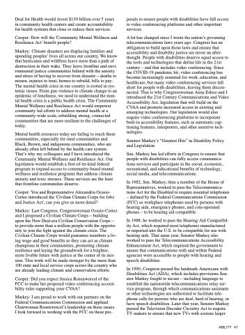 A lot has changed since I wrote the nation’s governing telecommunications laws years ago. Congress has an obligation to build upon those laws and ensure that accessibility and disability justice are never an after- thought. People with disabilities deserve equal access to the tools and technologies that define life in the 21st century – and that includes video conferencing. Since the COVID-19 pandemic hit, video conferencing has become increasingly essential for work, education, and healthcare, but many video conferencing services fall short for people with disabilities, leaving them discon- nected. That is why Congresswoman Anna Eshoo and I introduced the 21st Century Communications and Video Accessibility Act, legislation that will build on the CVAA and promote increased access in existing and emerging technologies. Our legislation would also require video conferencing platforms to incorporate built-in accessibility features, such as automatic cap- tioning features, interpreters, and other assistive tech- nologies.