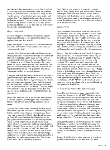 Goga: And you have a lot of information on the website. I saw that you have guest bloggers who contribute dif- ferent points of view from varying disability experi- ences.