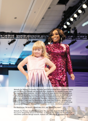 Michelle Sie Whitten, Co-founder, President, and CEO of Global Down syndrome Founda- tion (GLOBAL) is a friendly and intelligent force. Inspired by her daughter Sophia, who was born with Down syndrome, GLOBAL has had the same mission since its conception. They focus on spreading awareness that people with Down syndrome are important mem- bers of society and that they have been deprived of fundamental human rights and civil rights, such as medical care and research. Michelle, a longtime friend of ABILITY, had a chat with Chet Cooper and Lia Martirosyan on the latest with GLOBAL, including how GLOBAL’s hard work and persistence lead to exciting new research as well as publishing the peer-reviewed paper: “Medical Care Guidelines for Adults with Down syndrome.”