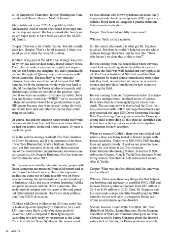 Whitten: There were three key things that that helped our lobbying and advocacy to establish INCLUDE and increase Down syndrome research from $27 million in 2016 to $130 million in 2023. First, Dr. Espinosa and his team made a huge scientific breakthrough in 2016 whereby we are now able to categorize Down syn- drome as an immune system disorder.