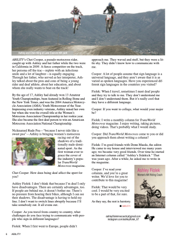 ABILITY’s Chet Cooper, a pseudo-motocross rider, caught up with Ashley and her father while the two were in California in 2009. A fierce competitor on the track, her persona off the trac—replete with an infectious smile and a lot of laughter—is equally engaging. Through her father, who served as her interpreter, Ash- ley talked about the pros and cons of being a young rider and deaf athlete, about her education, and about whom she really wants to beat on the track!