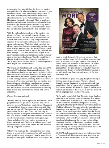Our senior director of research and medical care, Bryn Gelaro LSW, is leading this impactful initiative. We picked nine medical areas, and we did inclusion/exclu- sion criteria on research studies for all the major med- ical directors of the centers together. We came up with a really strong guideline, so strong that it was published in JAMA. We are now confident that any medical pro- fessional can now find these guidelines and because they are published in JAMA we believe nearly every- one will also feel confident and comfortable following them even if they have only one patient with Down syndrome.