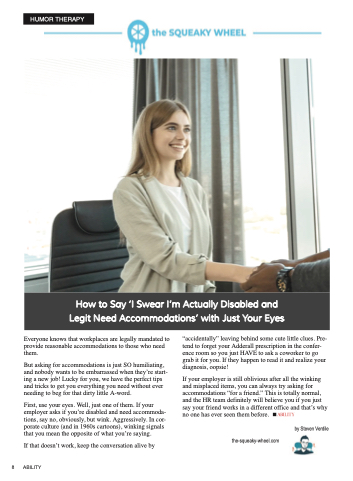 First, use your eyes. Well, just one of them. If your employer asks if you’re disabled and need accommoda- tions, say no, obviously, but wink. Aggressively. In cor- porate culture (and in 1960s cartoons), winking signals that you mean the opposite of what you’re saying.