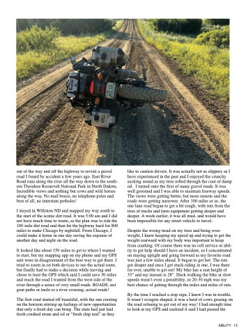 Despite the wrong tread on my tires and being over- weight, I knew keeping my speed up and trying to get the weight rearward with my body was important to keep from crashing. Of course there was no cell service or abil- ity to get help should I have an incident, so I concentrated on staying upright and going forward as my favorite road was just a few miles ahead. It began to get hot. The ruts got deeper and once I got stuck riding in one, I was there for ever, unable to get out! My bike has a seat height of 33” and my inseam is 28”. Duck walking the bike at slow speeds wasn’t even a possibility, so 20-30 mph was my best chance of getting through the miles and miles of ruts.