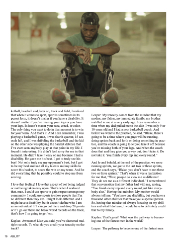 ketball, baseball and, later on, track and field, I realized that when it comes to sport, sport is sometimes in its purest form, it doesn’t matter if you have a disability. It doesn’t matter if you’re missing your legs or you have your legs. It doesn’t matter your race, creed, or color. The only thing you want to do in that moment is to win for your team. And that’s it. And I can remember, I was playing a basketball game, it was fourth quarter, 15 sec- onds left, and I was dribbling the basketball and the kid on the other side was playing the hardest defense that I’ve ever seen anybody play at that point in my life. I found it interesting. He didn’t feel sorry for me in that moment. He didn’t take it easy on me because I had a disability. He gave me his best. I got to truly see his best! Not only truly see my opponent’s best, but I got to be my best and use all my talents and my skills to score this basket, to score the win on my team. And he did everything that he possibly could to stop me from scoring.