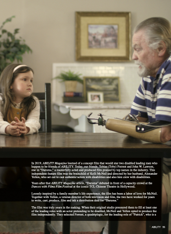 In 2019, ABILITY Magazine learned of a concept film that would star two disabled leading men who happen to be friends of ABILITY. Today, our friends, Tobias (Toby) Forrest and John W. Lawson, star in “Daruma,” a masterfully acted and produced film praised by top names in the industry. This independent feature film was the brainchild of Kelli McNeil and directed by her husband, Alexander Yellen, who set out to cast authentic actors with disabilities and also hire crew with disabilities.