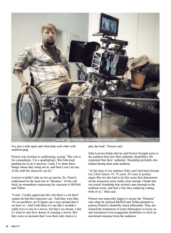 Forrest was especially happy to secure the “Daruma” role when he realized McNeil and Yellen planned to portray Patrick’s disability much differently. They dis- missed the temptation of some filmmakers to focus on and sometimes even exaggerate disabilities to elicit an emotional response from the audience.