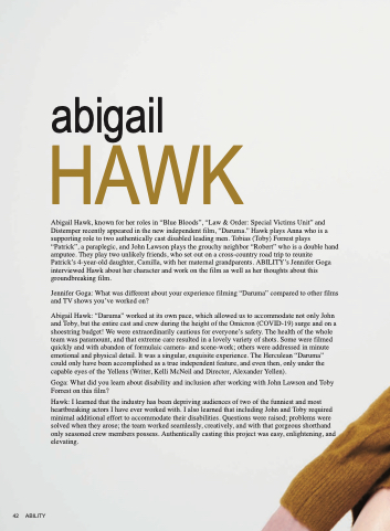 Abigail Hawk, known for her roles in “Blue Bloods”, “Law & Order: Special Victims Unit” and Distemper recently appeared in the new independent film, “Daruma.” Hawk plays Anna who is a supporting role to two authentically cast disabled leading men. Tobias (Toby) Forrest plays “Patrick”, a paraplegic, and John Lawson plays the grouchy neighbor “Robert” who is a double hand amputee. They play two unlikely friends, who set out on a cross-country road trip to reunite Patrick’s 4-year-old daughter, Camilla, with her maternal grandparents. ABILITY’s Jennifer Goga interviewed Hawk about her character and work on the film as well as her thoughts about this groundbreaking film.