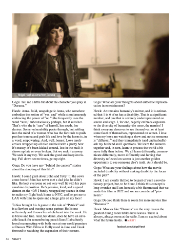 Hawk: Art remains humanity’s mirror, and it is estimat- ed that 1 in 6 of us has a disability. That is a significant number, and one that is severely underrepresented on screen and stage. I, for one, eagerly embrace exposure to the diversity of humanity–the more, the merrier! I think everyone deserves to see themselves, or at least some facet of themselves, represented on screen. I love when my boys are watching a show and notice someone is “different,” and they immediately (and unabashedly) ask my husband and I questions. We learn the answers together and, in turn, learn to process the world a bit more fully than before. We all learn differently, commu- nicate differently, move differently and having that diversity reflected on screen is just another golden opportunity to see someone else’s truth. As it should be.