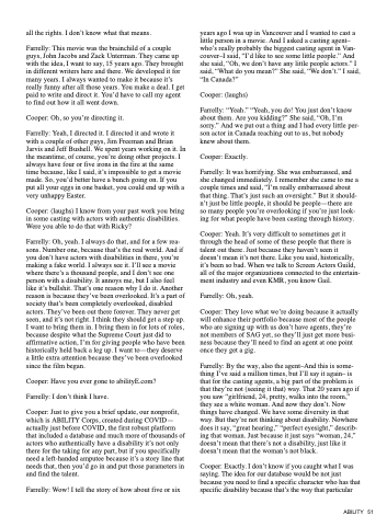 Farrelly: By the way, also the agent–And this is some- thing I’ve said a million times, but I’ll say it again– is that for the casting agents, a big part of the problem is that they’re not (seeing it that) way. That 20 years ago if you saw “girlfriend, 24, pretty, walks into the room,” they see a white woman. And now they don’t. Now things have changed. We have some diversity in that way. But they’re not thinking about disability. Nowhere does it say, “great hearing,” “perfect eyesight,” describ- ing that woman. Just because it just says “woman, 24,” doesn’t mean that there’s not a disability, just like it doesn’t mean that the woman’s not black.