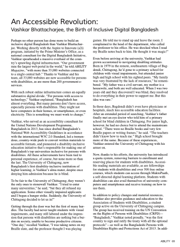 Perhaps no other person has done more to build an inclusive digital Bangladesh than Vashkar Bhattachar- jee. Working directly with the Aspire to Innovate (a2i) program, initiated by the Prime Minister’s Office, as a national consultant for the Digital Bangladesh Initiative, Vashkar spearheaded a massive overhaul of the coun- try’s sprawling digital infrastructure. “Our government runs the largest web portal in the world,” he told ABILITY Magazine, “with more than 33,000 websites connected to a single central hub.” Thanks to Vashkar and his team, all 33,000 websites are now accessible for persons with disabilities, as are more than 200 government e- services.