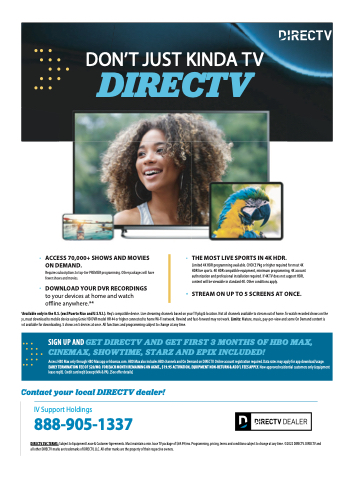 DIRECTV SVC TERMS: Subject to Equipment Lease & Customer Agreements. Must maintain a min. base TV package of $69.99/mo. Programming, pricing, terms and conditions subject to change at any time. ©2022 DIRECTV. DIRECTV and all other DIRECTV marks are trademarks of DIRECTV, LLC. All other marks are the property of their respective owners.