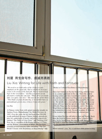 Since last winter Liu Xia has been living with her fami- ly in a rented apartment in the city, where the central heating system provides warmth and comfort. At night, she and her elder sister Liu Ning retreat to their bed- room to work at the computer. Illuminated by the moni- tor, Xia speaks into a microphone and the speech recog- nition software turns her speech into words. With great difficulty Ning uses the touchpad to correct the errors. Wind blows in from the window. When can I go back to my hometown for a visit, Xia now wonders. It looks as if the monitor light could shine on a distant past.