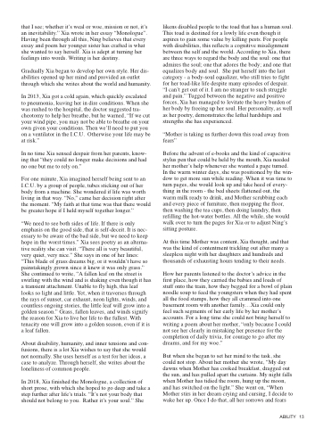 Gradually Xia began to develop her own style. Her dis- abilities opened up her mind and provided an outlet through which she writes about the world and humanity.