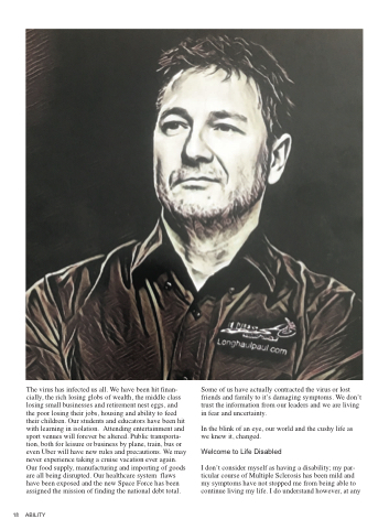 I don’t consider myself as having a disability; my par- ticular course of Multiple Sclerosis has been mild and my symptoms have not stopped me from being able to continue living my life. I do understand however, at any