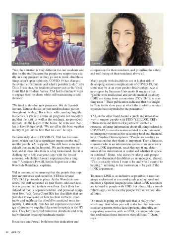 YAI, on the other hand, found a quick and innovative way to support people with I/DD. YEI LINK, YEI’s Information and Referral Department, created a resource, offering information about all things related to COVID-19, from information related to entertainment to emergency resources for accessing food and financial help. Caroline Dunn explains, “People are sending us information that they think is important. Then a linkster, someone who is an information specialist or supervisor in the LINK department, reads through it and deter- mines if this information is useful and whether it is new or outdated.” Dunn, who started working with people with developmental disabilities as an undergrad, shared, “This is exactly where I want to be and who I want to be helping,” referring to her motivation to be part of the LINK department.