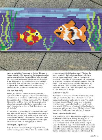 ramps as part of the ‘Menschen in Hanau’ (Humans in Hanau) initiative. She approached the organization after reading an article about Corinna Huber, who invented the Lego ramps and started building them in Bielefeld. When Rita realized that most German cities still lack accessibility, with her hometown Hanau not being an exception, Rita contacted Corinna, received the instructions, and planned to build her first ramp.