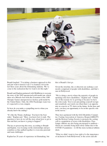 “We’re doing a movie where the majority of people in speaking roles have disabilities,” Kaplan said. “I think one of the reasons we’re growing is because we have the roles ready. You’re not just putting yourself on tape and somebody can watch you when there’s an opportu- nity in a movie or TV show in the future. In the here and now, you have an opportunity to be in this specific role in the movie.”