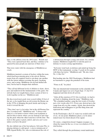 Middleton inserted a system of hockey within the team, which had been missing prior to his arrival. Before, teams from all countries tried to out-skate one another with the fastest athletes securing the puck, breaking away, and scoring. Middleton saw he had skilled ath- letes, but he had to sharpen their skillsets.