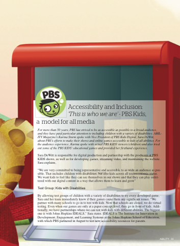 For more than 50 years, PBS has strived to be as accessible as possible to a broad audience, and they have paid particular attention to including children with a variety of disabilities. ABIL- ITY Magazine’s Karina Sturm spoke with Vice President of PBS Kids Digital, Sara DeWitt, about PBS’s efforts to make their shows and online games accessible to kids of all abilities. For the audience experience, Karina spoke with actual PBS KIDS viewers (children) and also tried out some of the PBS KIDS’ educational games and provided her firsthand experience.
