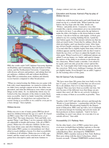 Slidea-ma-zoo is one of many games PBS has devel- oped for children between the age of 2 and 8. It’s based on PBS’s series The CAT in the HAT knows a Lot About That! The main characters, Nick and Sally, race against Thing 1 and Thing 2 on two separate slides that are adjustable in height and texture. Like all of PBS’s games, Slidea-ma-zoo educates children. In this case, they learn about cause and effect thinking. However, what makes PBS’s games so extraordinary isn’t their effort to teach children a lesson, It is their accessibility to children of all abilities. Slidea-ma-zoo is fully cap- tioned, and the sound can be switched on or off. Other games have descriptive audio and more features to