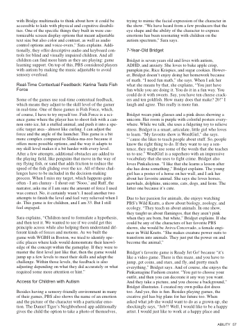 with Bridge multimedia to think about how it could be accessible to kids with physical and cognitive disabili- ties. One of the specific things they built in were cus- tomizable screen display options that meant adjustable text size but also color and contrast, as well as audio control options and voice-overs,” Sara explains. Addi- tionally, they offer descriptive audio and keyboard con- trols for blind and visually impaired children. And all children can find more hints as they are playing: game learning support. On top of this, PBS considered players with autism by making the music adjustable to avoid sensory overload.