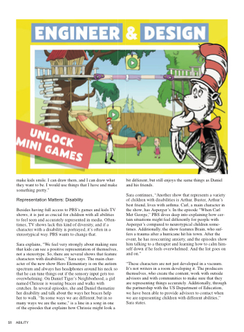 Sara explains, “We feel very strongly about making sure that kids can see a positive representation of themselves, not a stereotype. So, there are several shows that feature characters with disabilities,” Sara says. The main char- acter of the new show Hero Elementary is on the autism spectrum and always has headphones around his neck so that he can tune things out if the sensory input gets too overwhelming. On Daniel Tiger’s Neighborhood, a girl named Chrissie is wearing braces and walks with crutches. In several episodes, she and Daniel thematize her disability and talk about the ways her braces help her to walk. “In some ways we are different, but in so many ways we are the same,” is a line in a song in one of the episodes that explains how Chrissie might look a