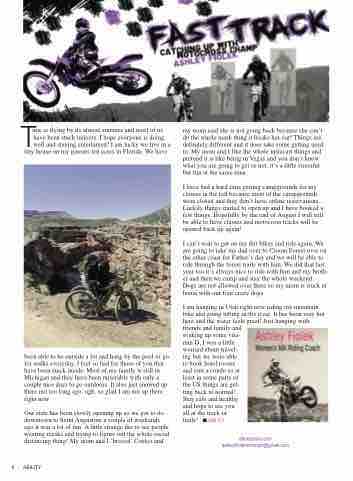 I canʼt wait to get on my dirt bikes and ride again. We are going to take my dad over to Croom Forest over on the other coast for Fatherʼs day and we will be able to ride through the forest trails with him. We did that last year too itʼs always nice to ride with him and my broth- er and then we camp and stay the whole weekend. Dogs are not allowed over there so my mom is stuck at home with our four crazy dogs.