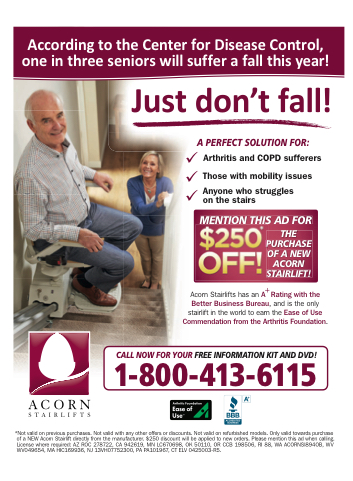 *Not valid on previous purchases. Not valid with any other offers or discounts. Not valid on refurbished models. Only valid towards purchase of a NEW Acorn Stairlift directly from the manufacturer. $250 discount will be applied to new orders. Please mention this ad when calling. License where required: AZ ROC 278722, CA 942619, MN LC670698, OK 50110, OR CCB 198506, RI 88, WA ACORNSI894OB, WV WV049654, MA HIC169936, NJ 13VH07752300, PA PA101967, CT ELV 0425003-R5.