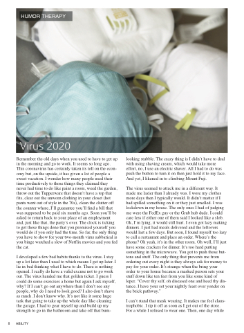 The virus seemed to attack me in a different way. It made me lazier than I already was. I wore my clothes more days then I typically would. It didn’t matter if I had spilled something on it or they just smelled. I was lockdown in my house. The only ones I had of judging me were the FedEx guy or the Grub hub dude. I could care less if either one of them said I looked like a slob. Ok, I’m lying, it would still hurt. I even got lazy making dinners. I just had meals delivered and the leftovers would last a few days. But soon, I found myself too lazy to call a restaurant and place an order. Where’s the phone? Oh yeah, it’s in the other room. Oh well, I’ll just have some crackers for dinner. It’s too hard putting something in the microwave. You got to push those but- tons and stuff. The only thing that prevents me from ordering out every night is they always ask for money to pay for your order. It’s strange when the bring your order to your house because a masked person sets your stuff down like ten feet from you like some kind of leper. “Cover thy self, oh diseased one and heed thy dis- tance. I have your set your nightly feast over yonder on the brick pathway.”